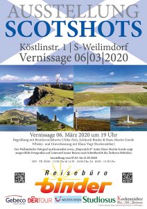 Vom 7. bis 21. März 2020 verwandelt sich das Reisebüro Binder in Stuttgart-Weilimdorf in eine Bildergalerie: „Scotshots“, rund 20 ausgewählte, farbenprächtige und eindrucksvolle Bilder aus Schottland werden zu sehen sein. Die Vernissage, die von Bezirksvorsteherin Ulrike Zich eröffnet wird, findet am 6. März 2020 um 19 Uhr statt.