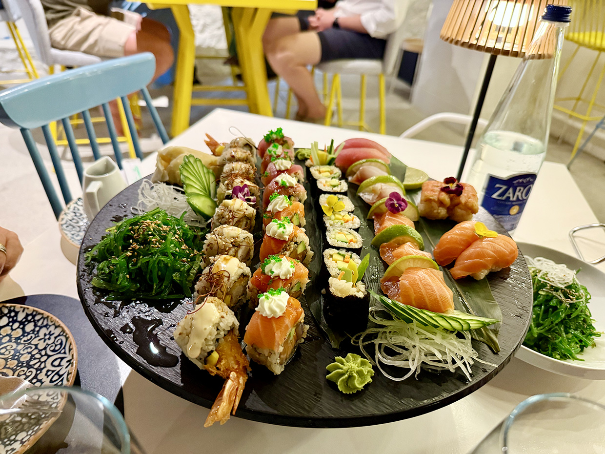 Und so testeten wir uns neuerlich durch die neuen wie alten Metze (Vorspeisen) wie Fischvarianten – und trauten uns erstmals auch an die Sushi-Karte des SCALA. Hier wurden wir positiv überrascht. Eine weitere angenehme Überraschung war, dass das SCALA mit dem Botanist Gin von der Bruichladdich-Distillery auf Islay eine schottische Note nach Matala gebracht hat, da fühlt man sich doch gleich „wie zu Hause“. Warum nur Schottland und Griechenland in ihren Flaggen beide das Blau/Weiss verwenden 😉 ?